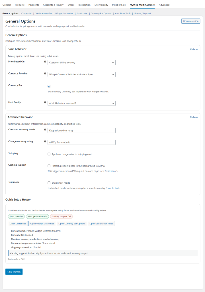This area controls the core behavior of the plugin, including pricing logic, currency display behavior, shipping conversion support, test mode, and general storefront options that affect how visitors experience regional and multi-currency pricing.